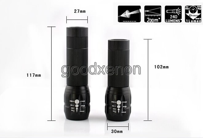 Features: Modes: 3 modes, High / Low / Strobe Distance: 600 Feet / 200 Meters 500 Lumen Zoomable LED Flashlight Torch Lamp base: CREE, high power LED. With a lifespan of up to 100,000 hours or more Water resistance, but do not put it into water Crenellated strike bezel for enhanced self-defense Max output: 600 lumens Light Color: Cool White |